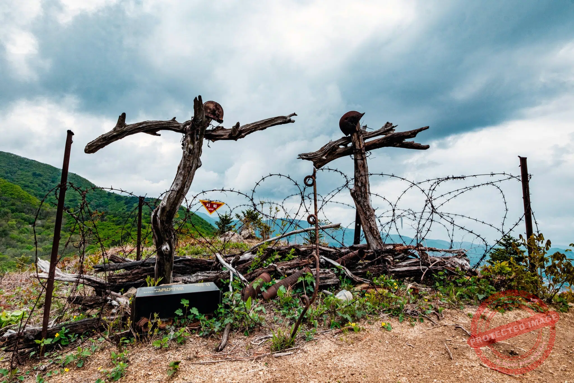 Bimok (비목), which means “wooden tomb”, is a word used to describe the graves dug in haste for soldiers killed during the Korean War, often marked with branches and equipment that belonged to the deceased, such as a helmet.