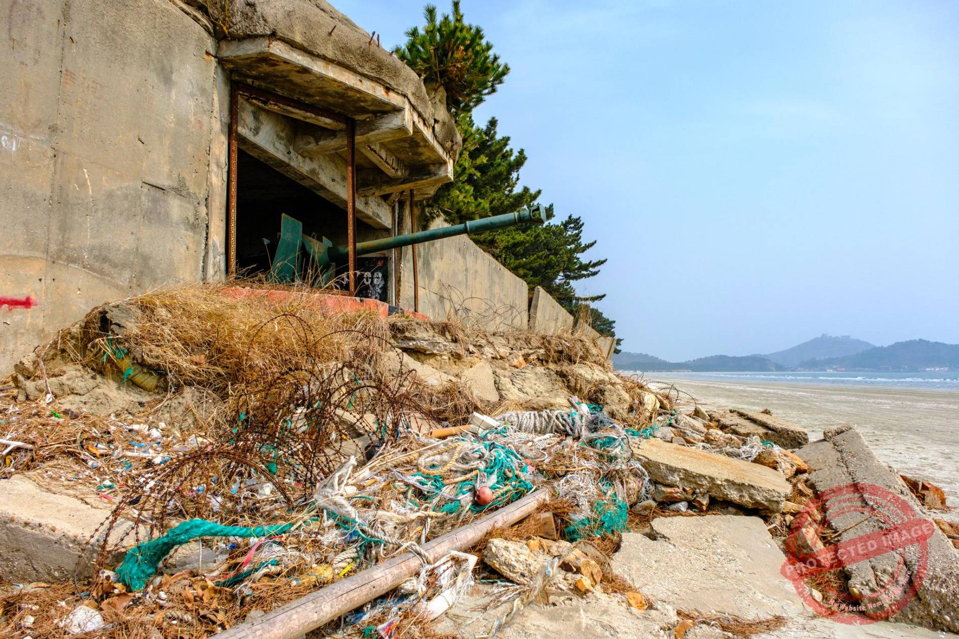 Garbage washed up on a beach next to a coastal battery. Some people rummage through this rubbish in the hope of discovering North Korean artifacts.