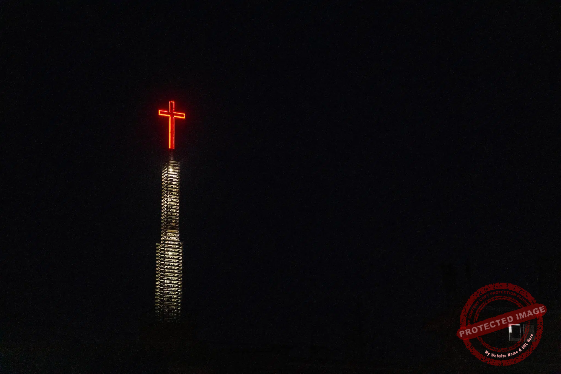 A church’s luminous red cross shines in the night in Baengnyeong Island’s main town (March 2025).