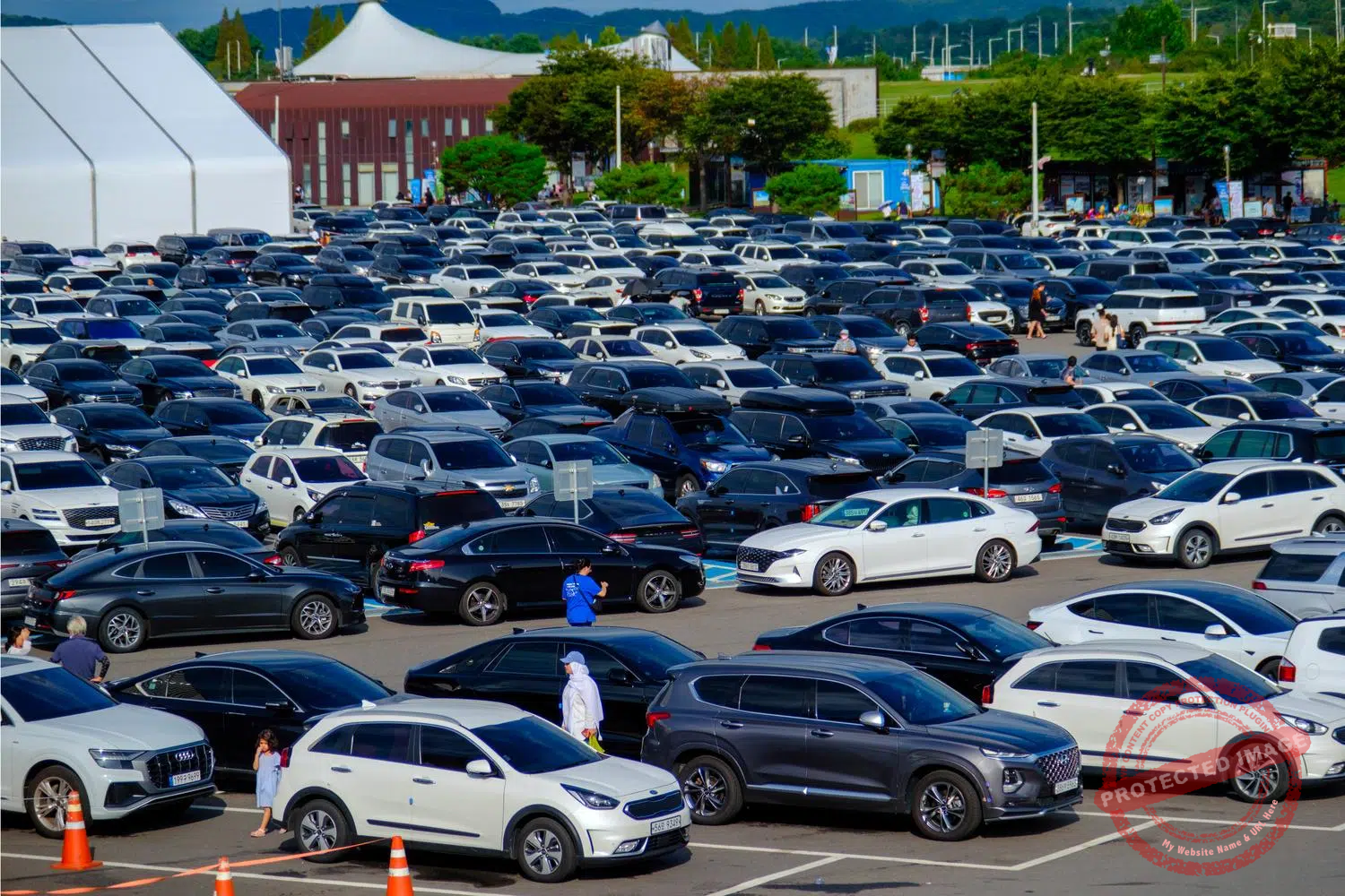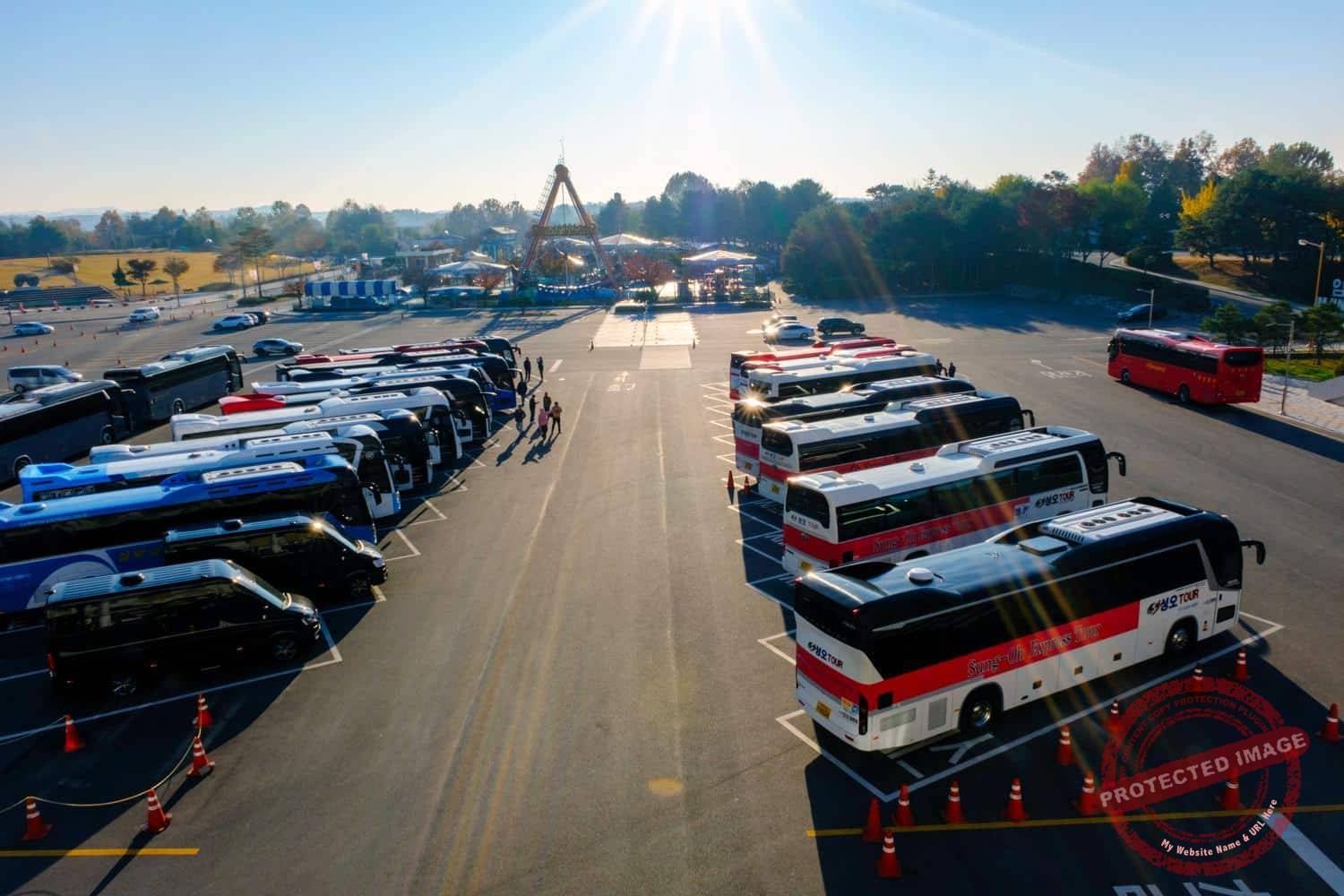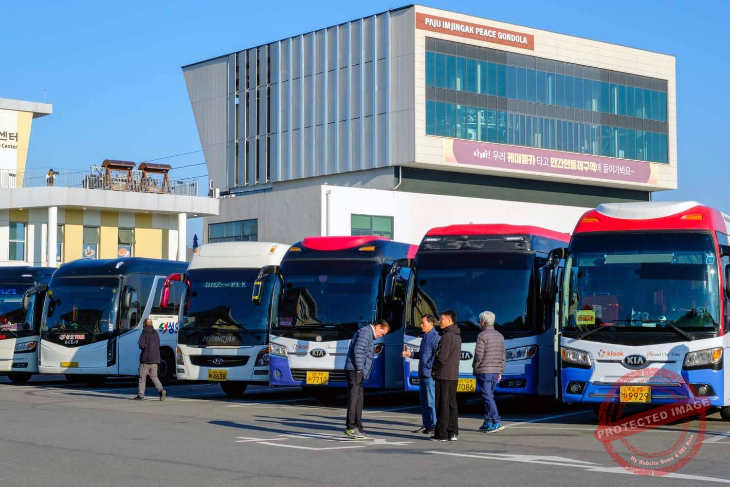 Tour buses and private vehicles fill the Imjingak complex parking lot, and tour guides queuing for tickets to enter the Civilian Control Zone and continue to the DMZ area main tourist attractions (September and November 2024, September 2025).