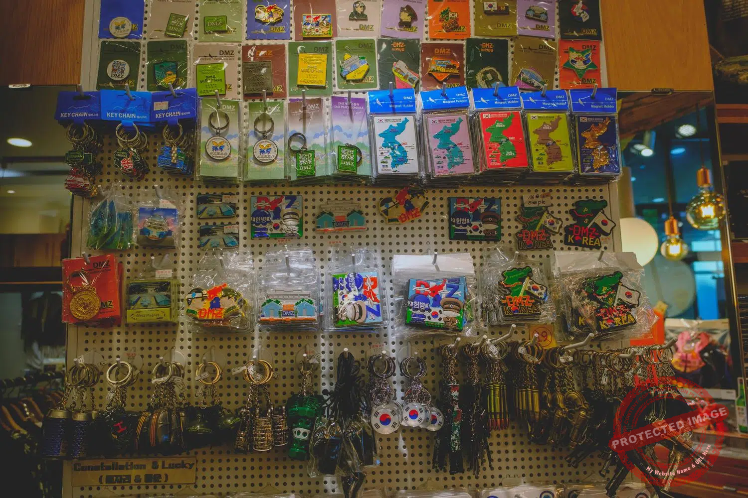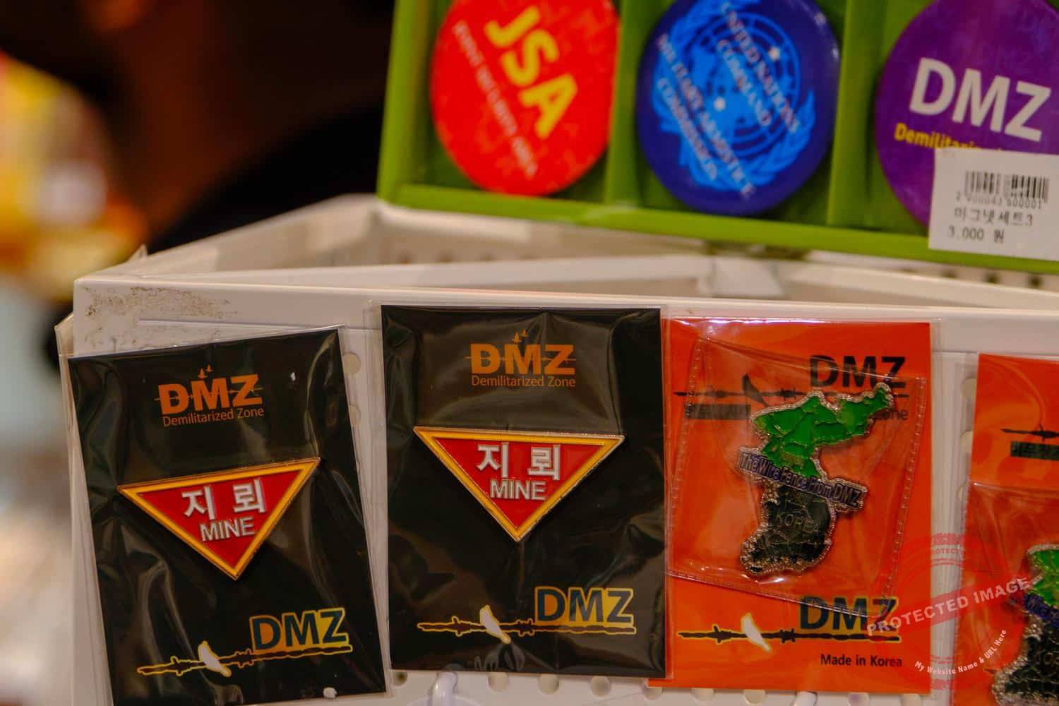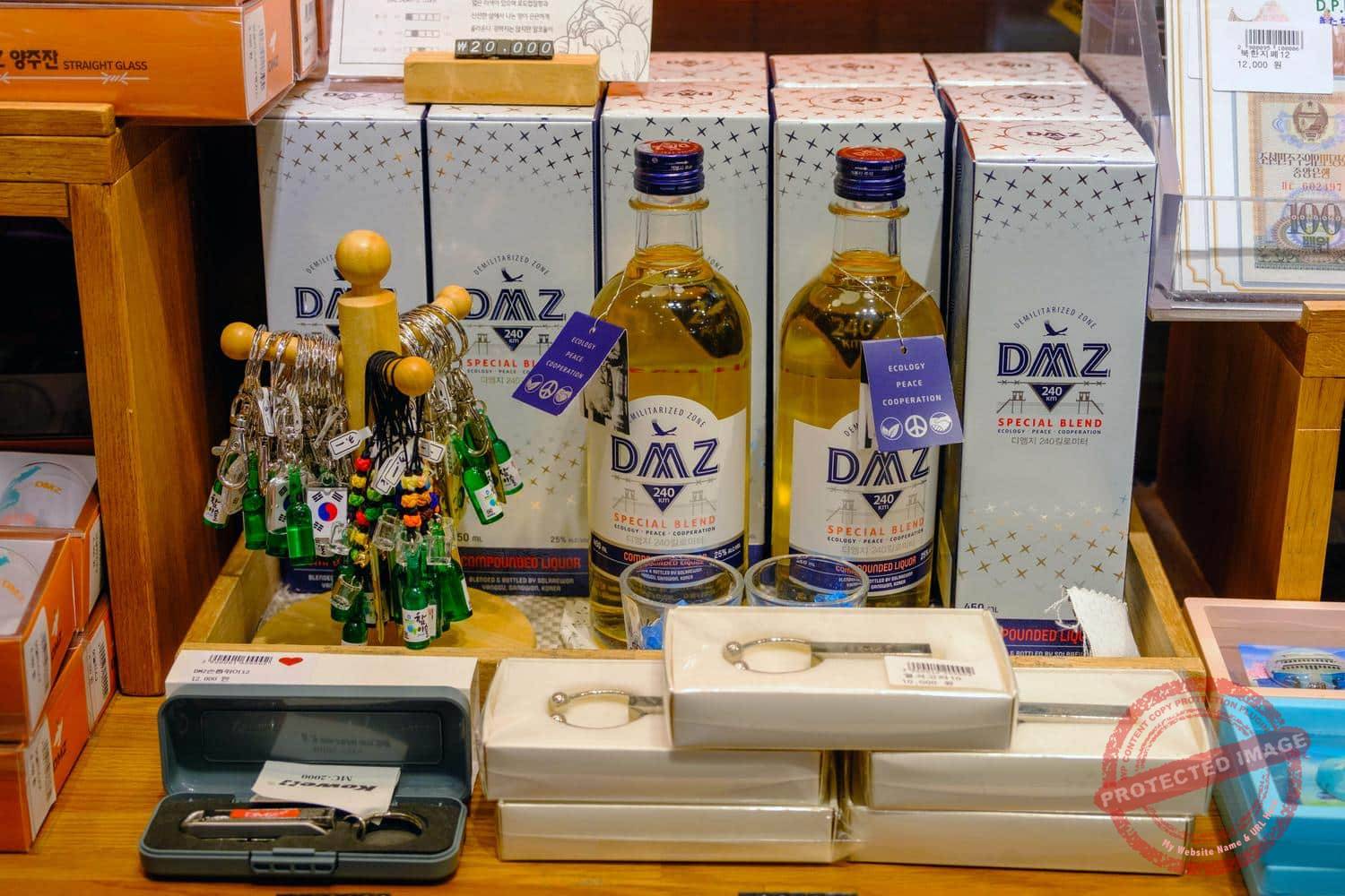 Grenade or bullet-shaped key-rings and chocolates, minefield magnets and DMZ booze on sale at the Imjingak souvenir shops (September and November 2024, September 2025).