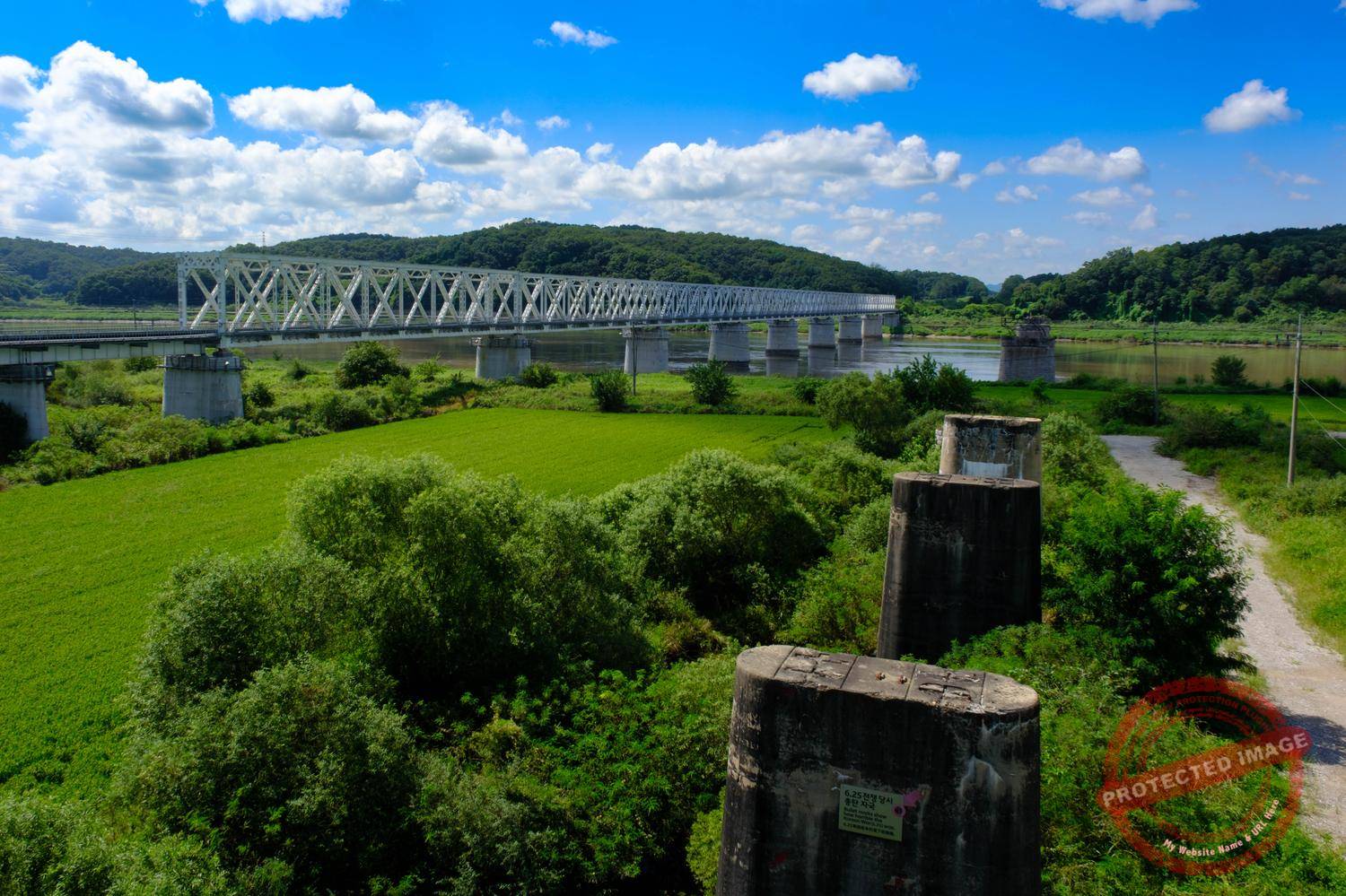 The railway bridge across the Imjin River at Imjingak. On the right, the bullet-riddled pillars of the old bridge, destroyed during the Korean War (September 2025).