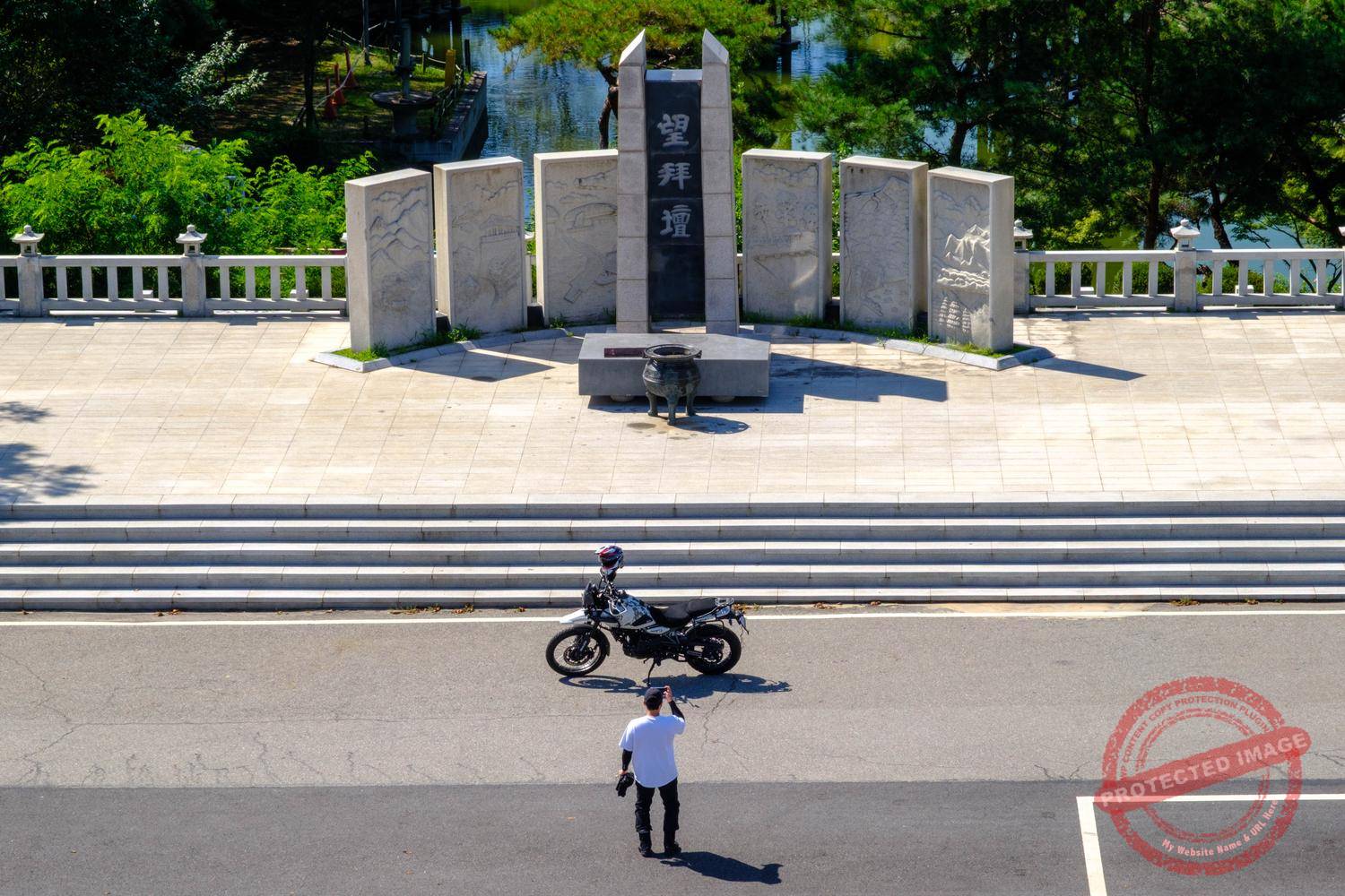 A biker takes a photo of his motorcycle in front of the Mangbaedan, an altar where separated Korean families come to perform ancestral rites during major holidays (September 2025).