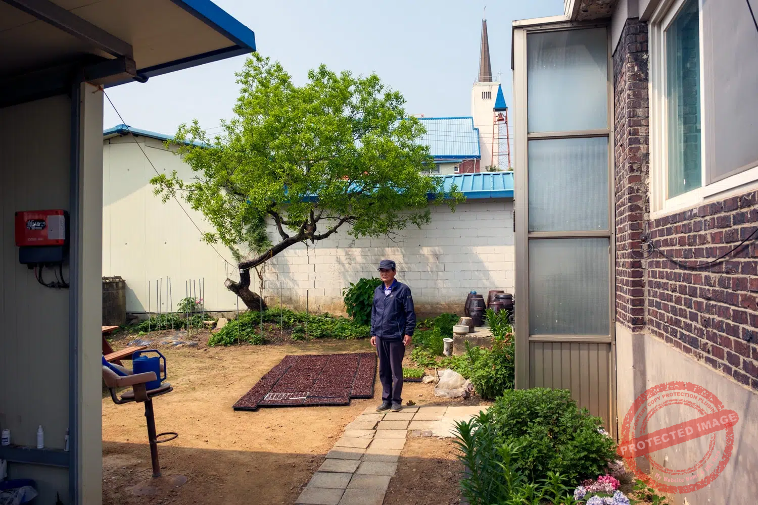 Kwon Yeong-han, a resident of Tongilchon, stands in his house's yard (May 2025).