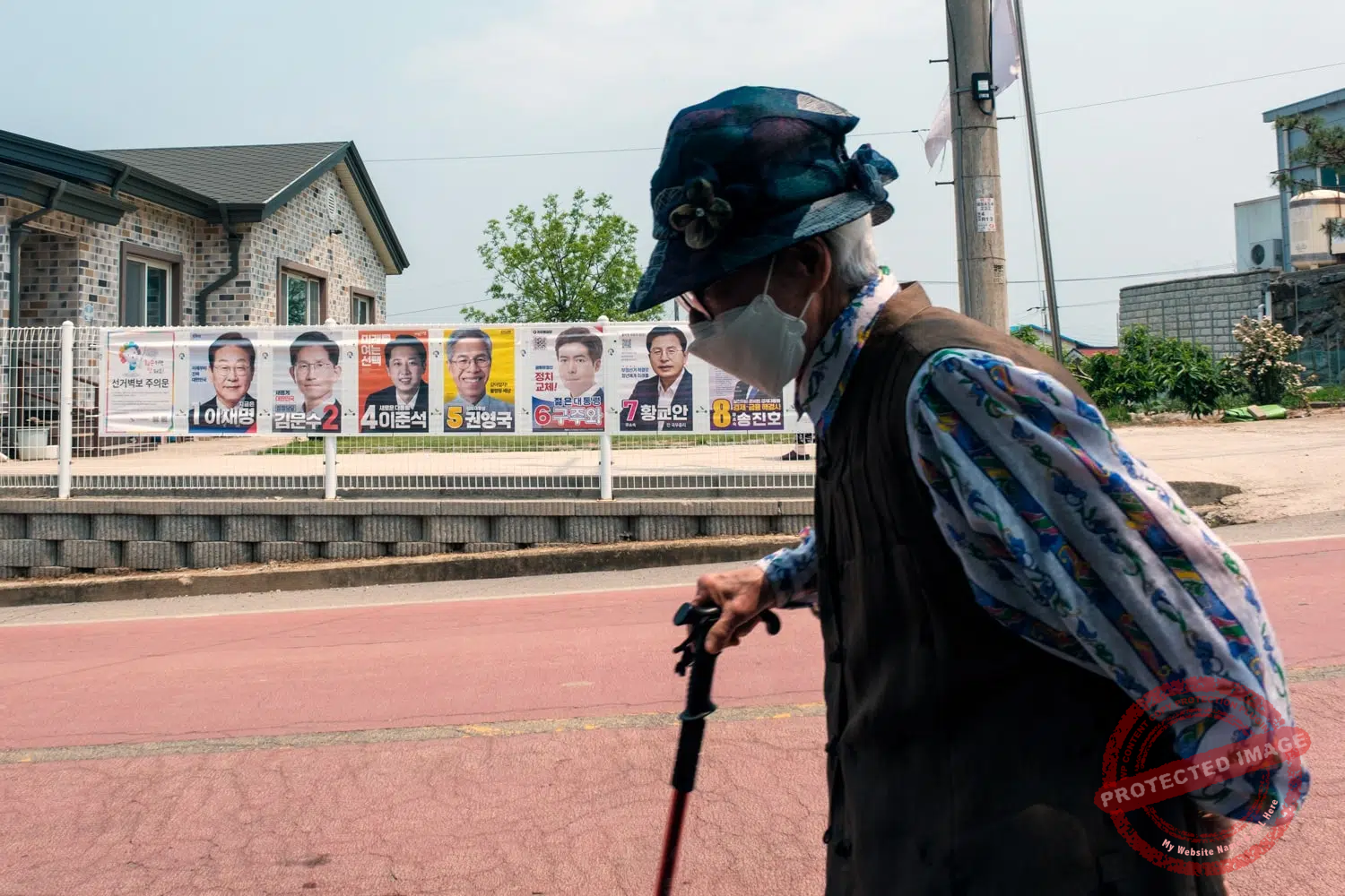 A resident of Tongilchon walks past election posters for the South Korean presidential election in June 2025 (May 2025).