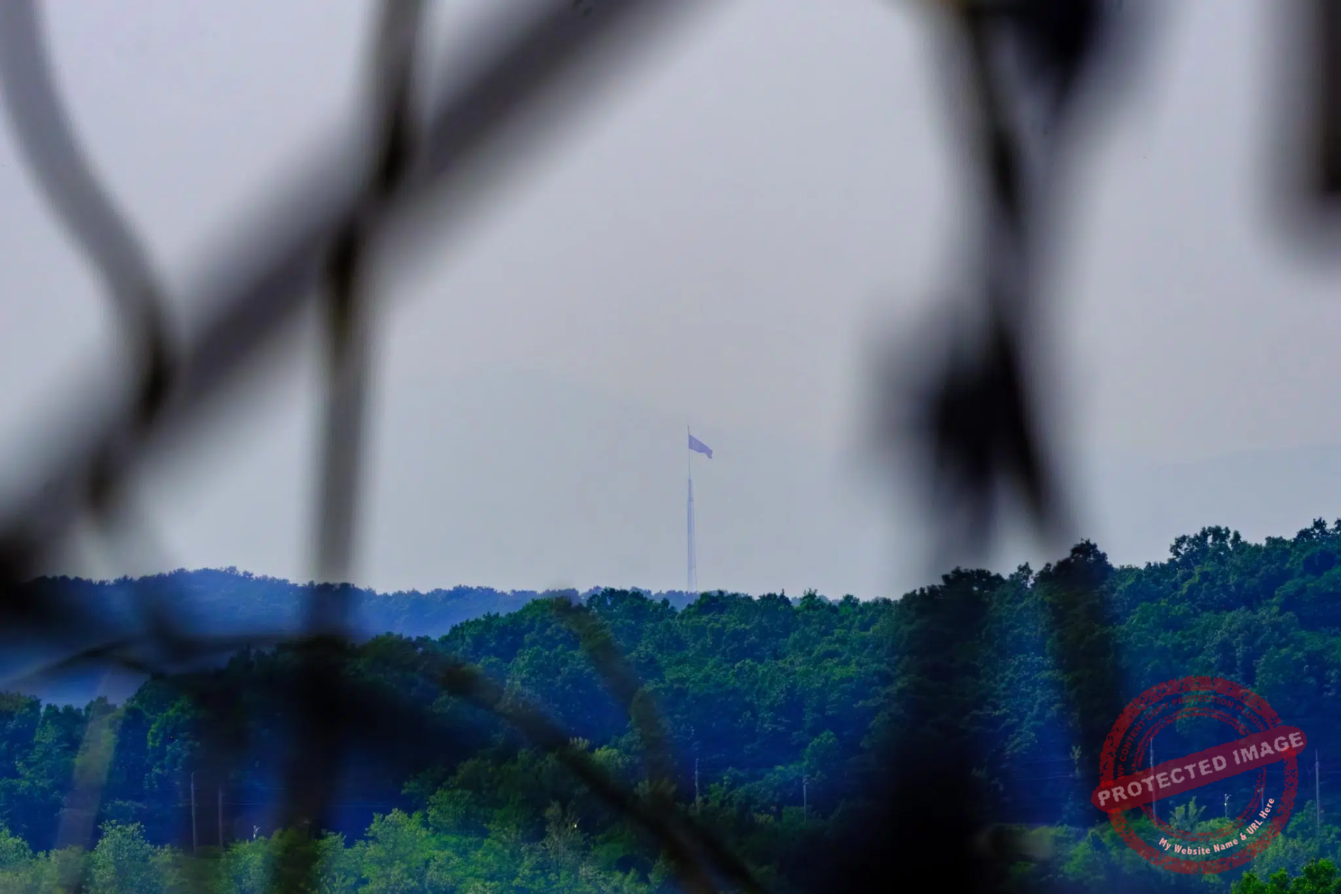 A giant North Korean flag floats atop a 160-meter highg flagpole across the border, seen from Paju’s Unification Village (May 2025).