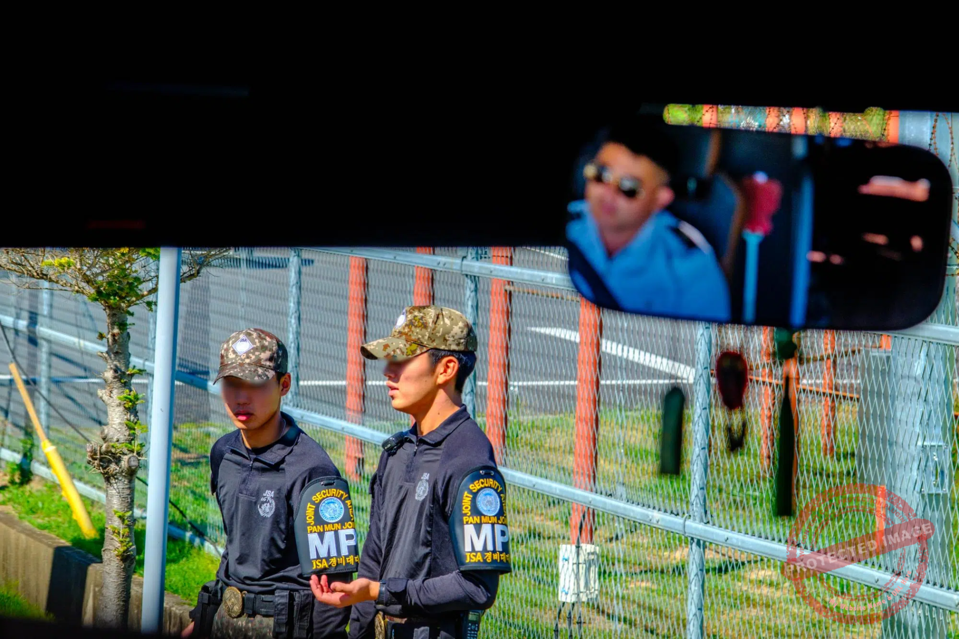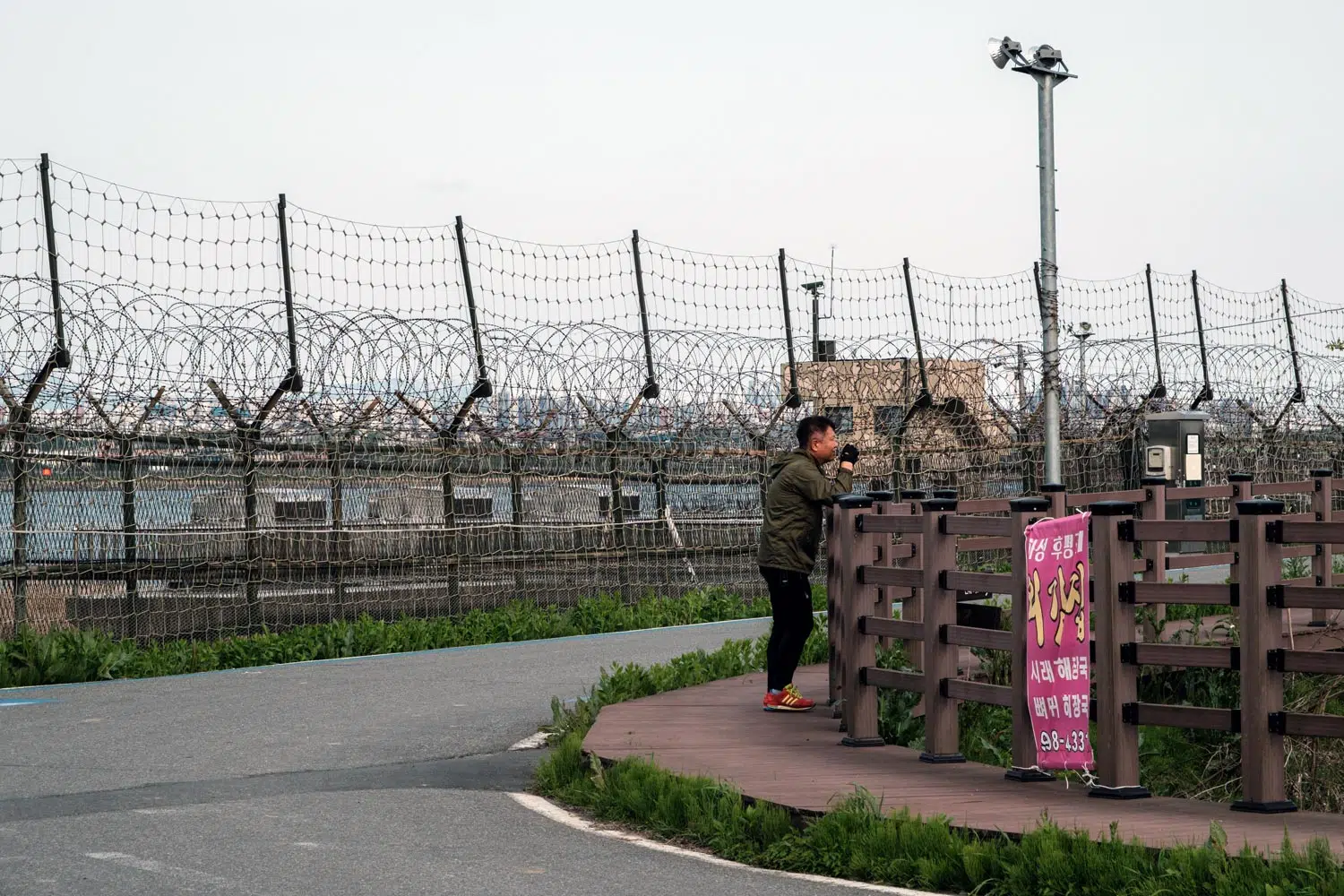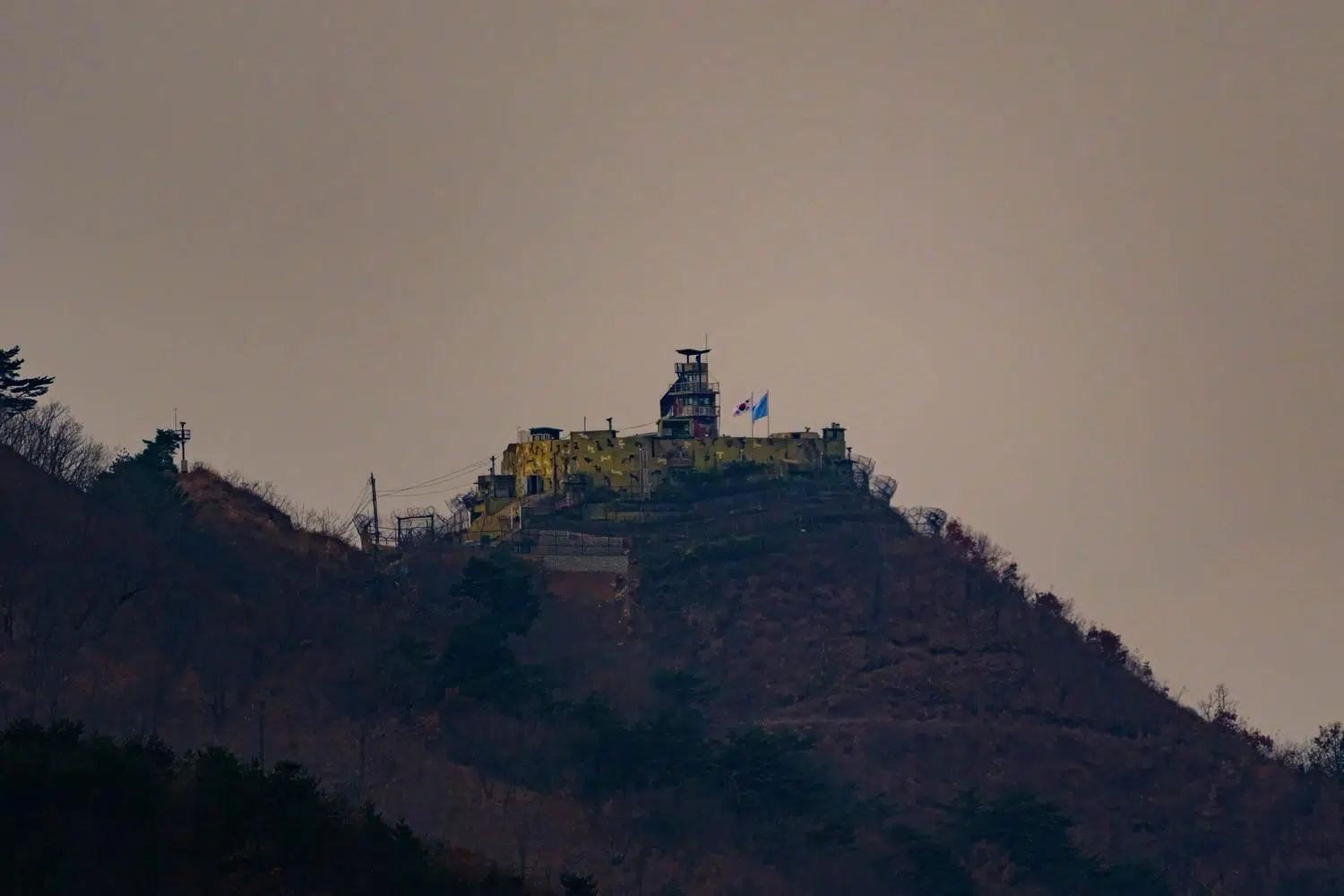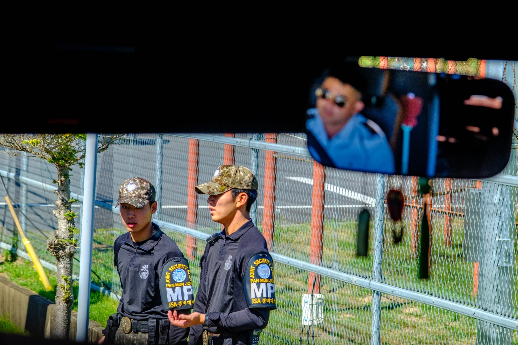 To access the remote Eulji Observatory located deep inside the DMZ around 300 meters from the demarcation line, civilians need to travel in a convoy escorted by two armoured vehicles. A black tape is affixed to the lens of each mobile phone and a hood to the dashcams of each car, whose trunk and underside is rigorously inspected at a checkpoint in case an intruder is hiding there.