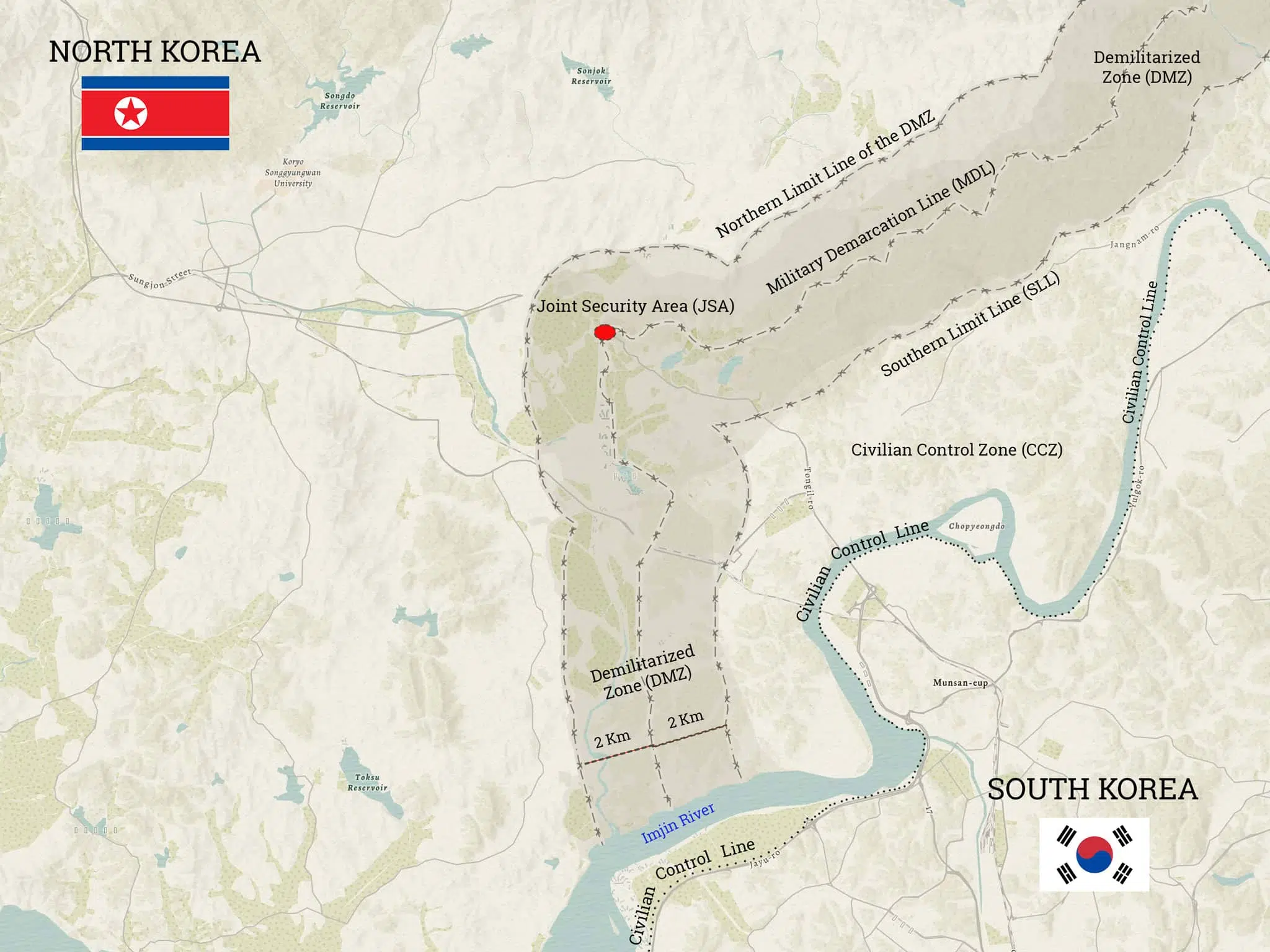 The border area around Panmunjom. The Military Demarcation Line (MDL) marks the border between the two Koreas. On either side is a two-kilometer-wide strip known as the Demilitarized Zone (DMZ), bounded to the north by the Northern Limit Line (NLL) and to the south by the Southern Limit Line (SLL). To the south, an additional strip is a restricted area known as the Civilian Control Zone (CCZ) bordered by the Civilian Control Line (CLL). The small Joint Security Area (JSA) lies at the heart of the DMZ. This is where the two armies face each other just a few meters apart. The map is approximate (Sources: Esri, TomTom, Garmin, FAO, NOAA, USGS, © OpenStreetMap).